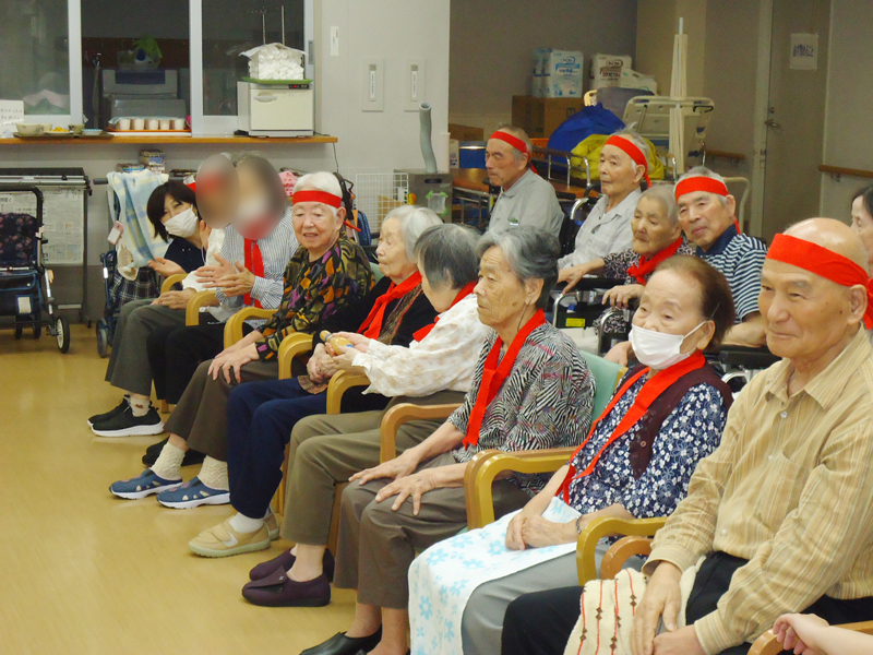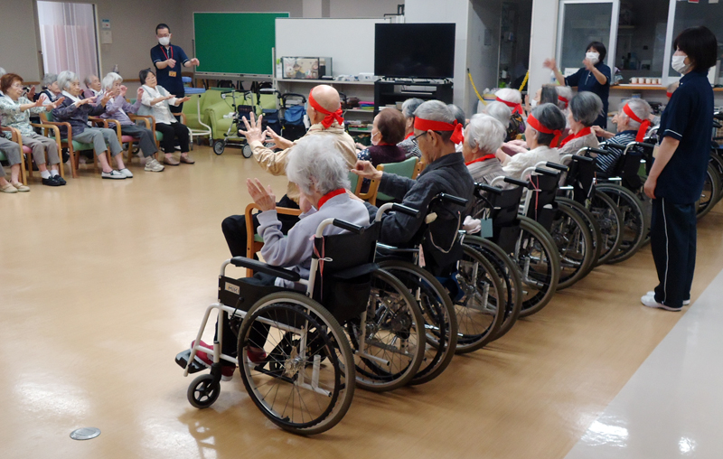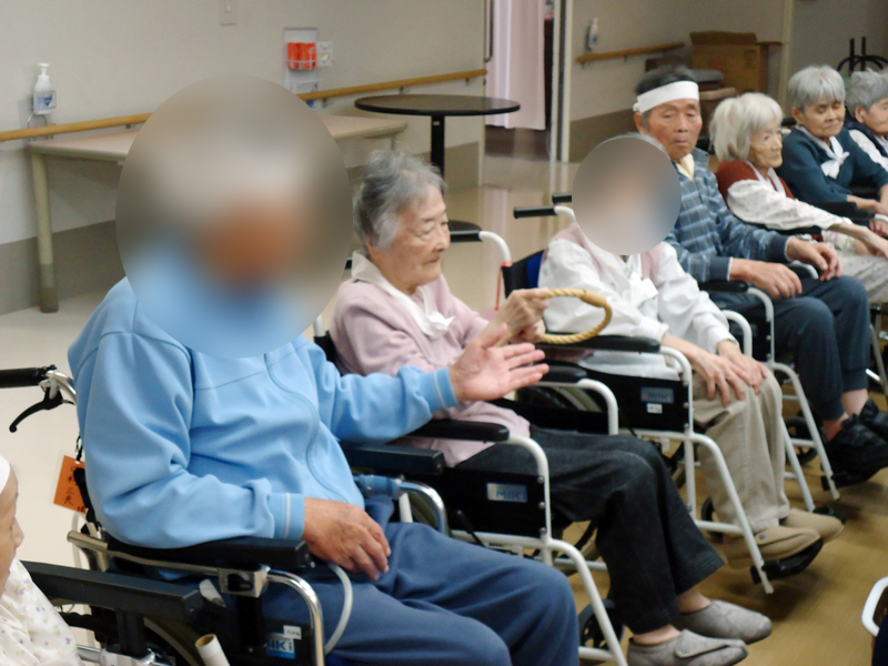 2024運動会 DATE 2024年6月15日 本日、西棟ホールにて「運動会」が開催されました。 ①選手宣誓 ②準備体操 ③ゲーム(渡して貰って物送り・お菓子食べ競争) 怪我をしないようにしっかりと準備体操を↑ 皆さん、日頃のリハビリの成果を発揮され各チームで協力して取り組まれました。