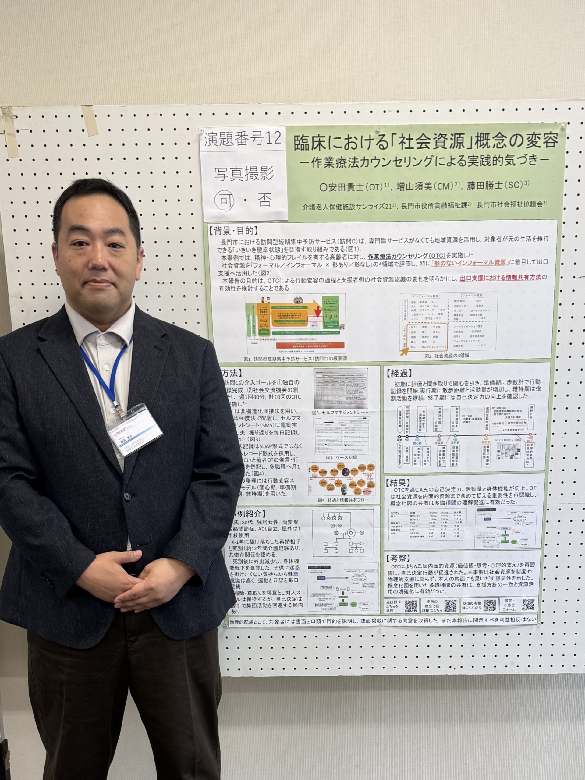 まずは、学会とは日頃の臨床で得られた知見や工夫を共有し、他の専門職の取り組みから学ぶことのできる貴重な機会です。今回の発表では、作業療法カウンセリングを通して、従来の「社会資源」をどのように捉え直せるかという実践的な気づきをまとめ、会場で多くの先生方にご覧いただきました。発表後には質問やご意見をいただき、新たな視点に気づくことができました。