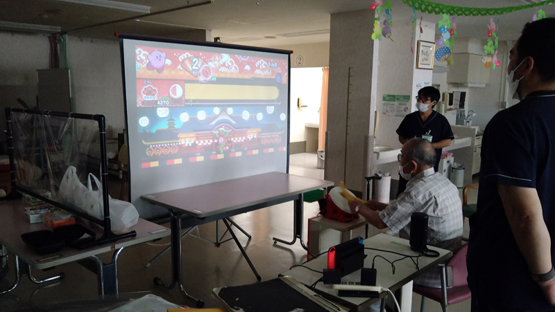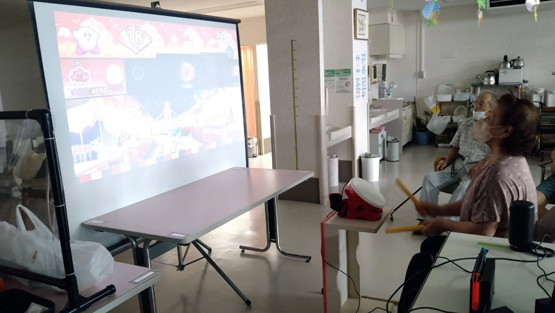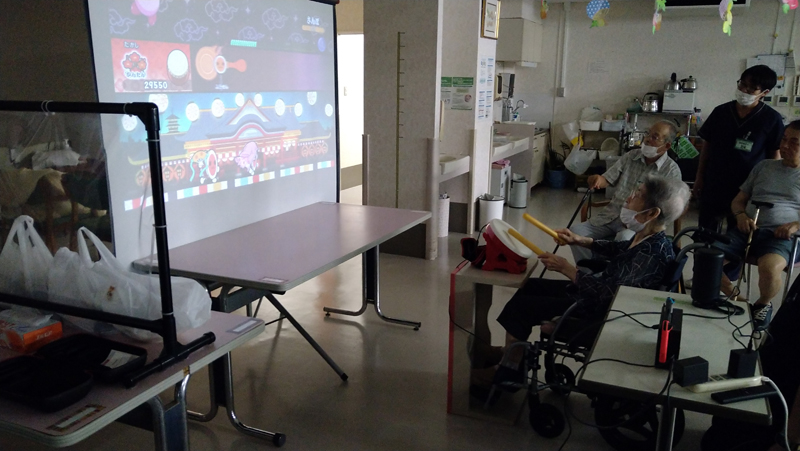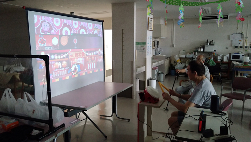リハビリ職員協力のもと「太鼓の達人」ゲームを用意し楽しんでいただきました。